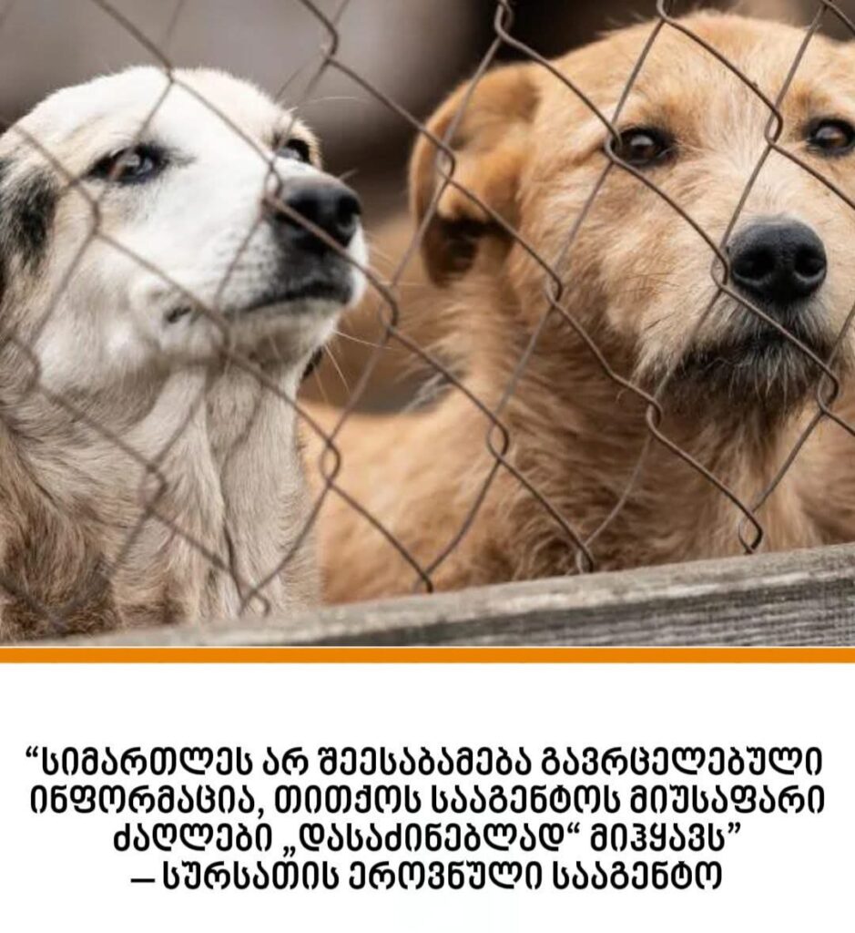 სურსათის ეროვნული სააგენტოს ინფორმაციით, სიმართლეს არ შეესაბამება გავრცელებული ინფორმაცია, თითქოს სურსათის ეროვნულ სააგენტოს მიუსაფარი ძაღლები „დასაძინებლად“ მიჰყავს.
